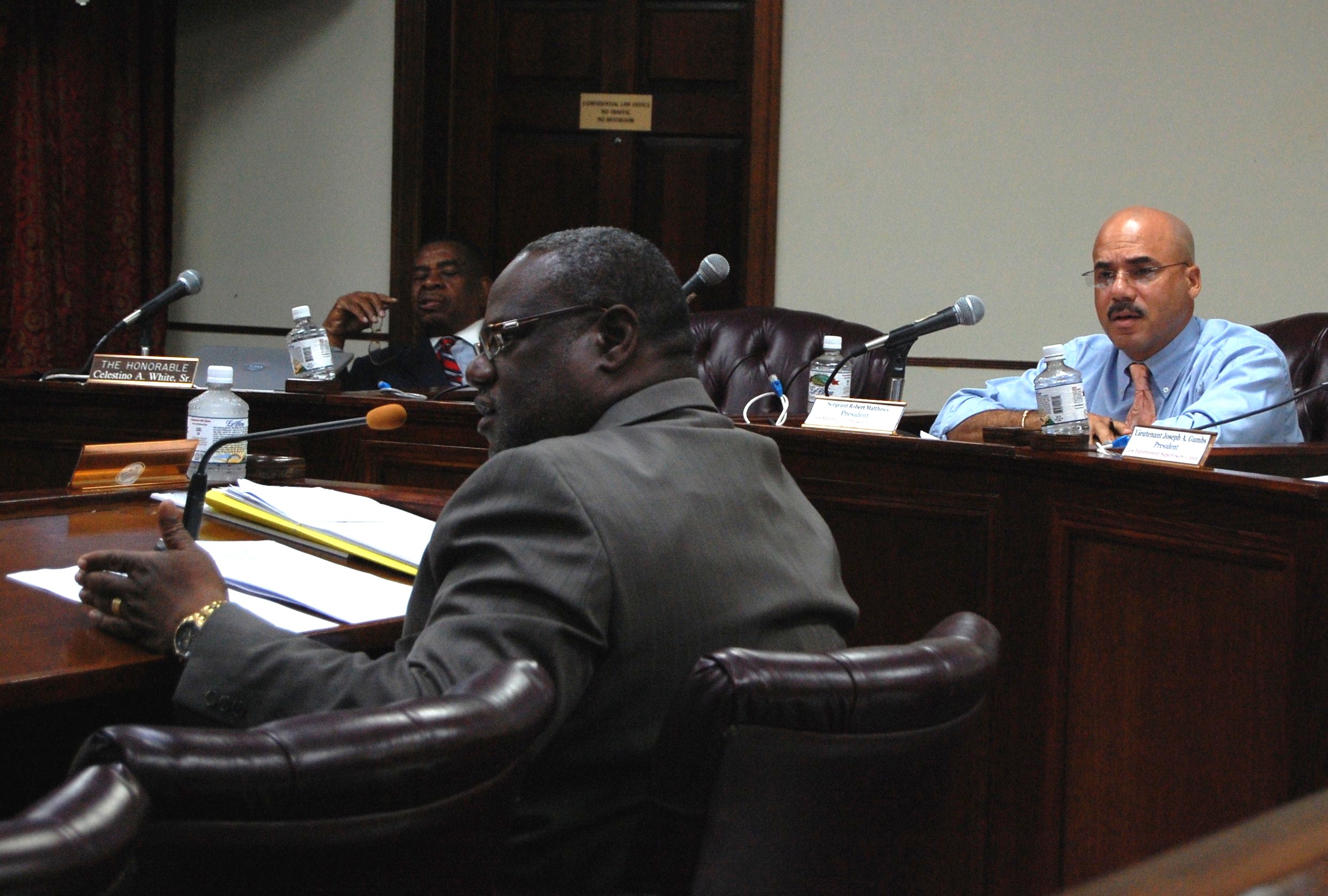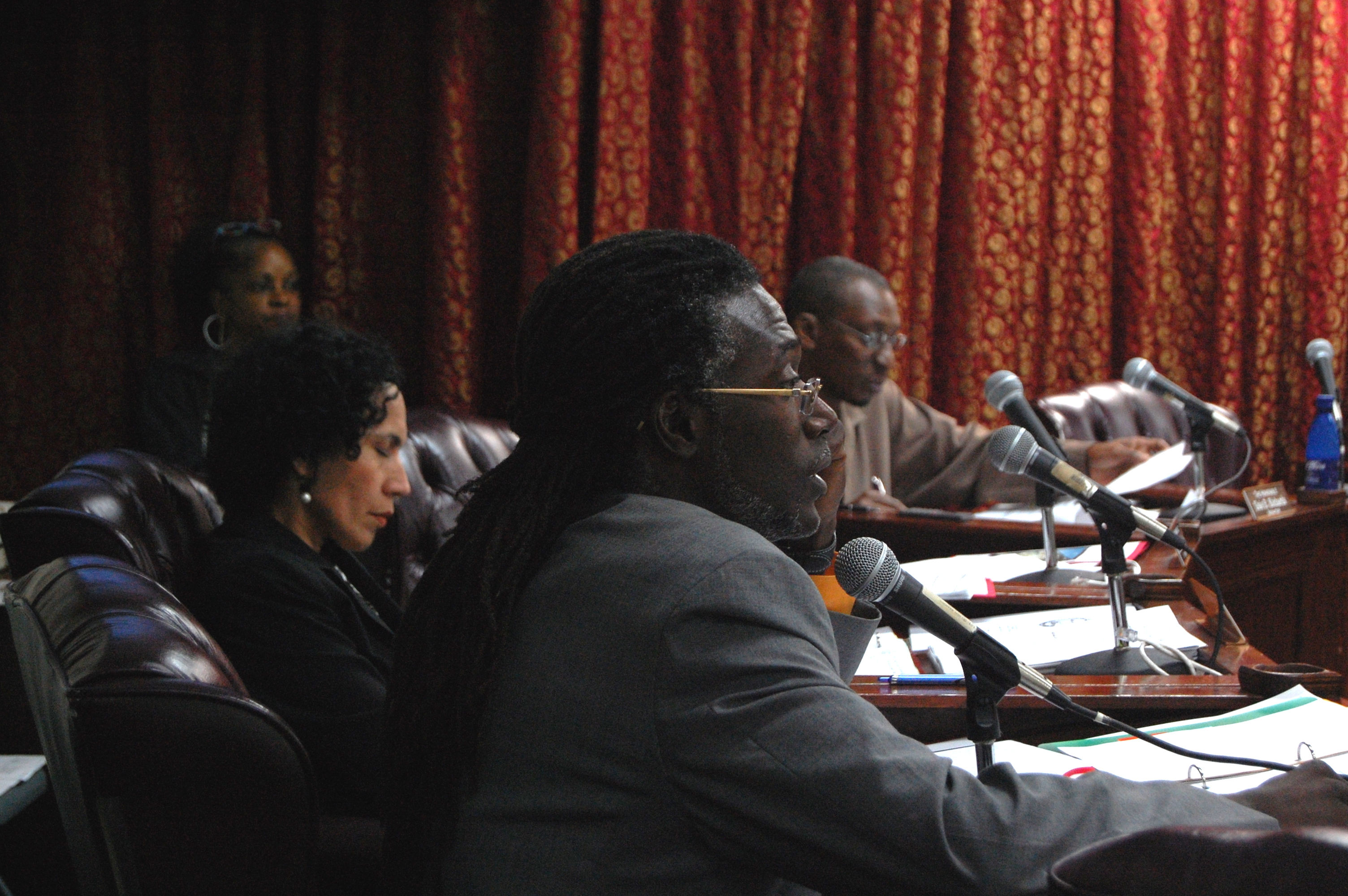 Sen. Celestino White questions testifiers on a federal peace officer bill during a hearing in Frederiksted.